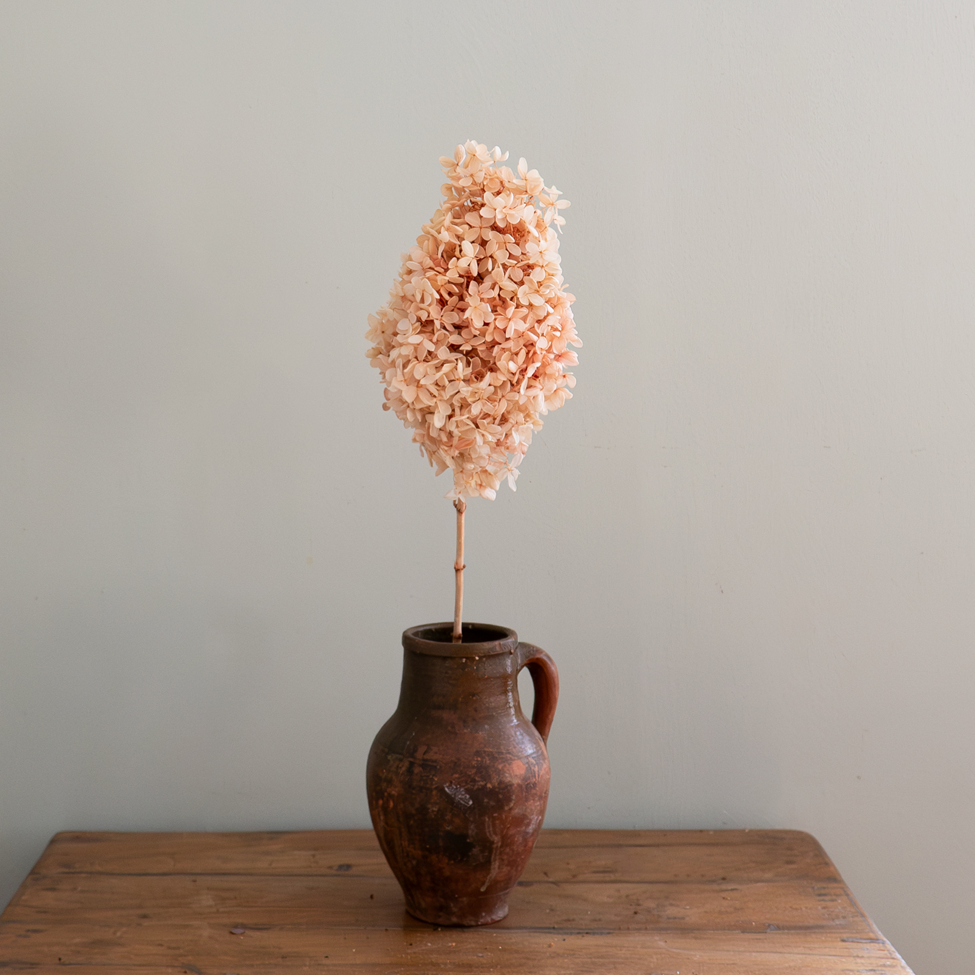 Rejäl konserverad torn-/konformad hortensia på kvist i vacker aprikos färg.