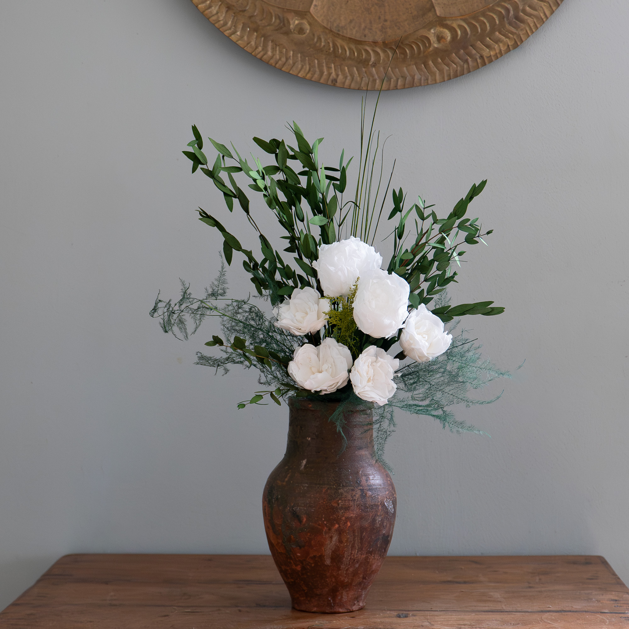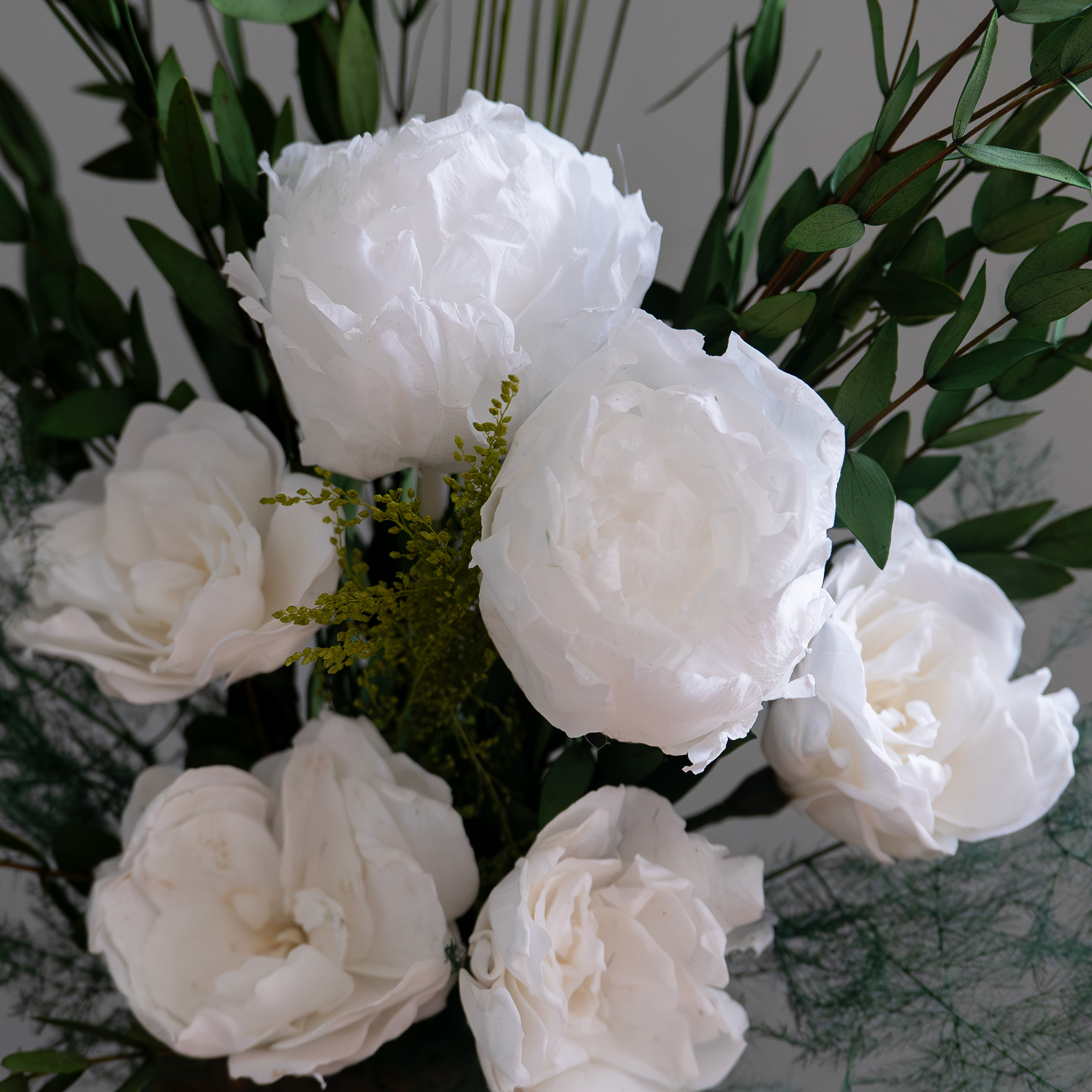 En vacker,, exklusiv bukett med konserverad pion (!) och gardenia.